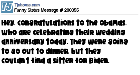 X says Hey, congratulations to the Obamas, who are celebrating their wedding anniversary today. They were going to go out to dinner, but they couldn’t find a sitter for Biden.