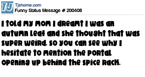 X says I told my mom I dreamt I was an autumn leaf and she thought that was super weird, so you can see why I hesitate to mention the portal opening up behind the spice rack.