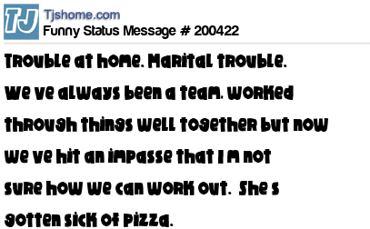 X says Trouble at home. Marital trouble. We’ve always been a team, worked through things well together but now we’ve hit an impasse that I’m not sure how we can work out. She’s gotten sick of pizza.
