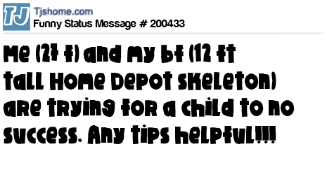 X says Me (27 f) and my bf (12 ft tall Home Depot skeleton) are trying for a child to no success. Any tips helpful!!!