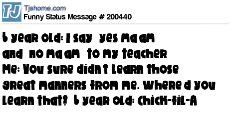 X says 6 year old: I say “yes ma’am” and “no ma’am” to my teacher Me: You sure didn’t learn those great manners from me. Where’d you learn that? 6 year old: Chick-fil-A