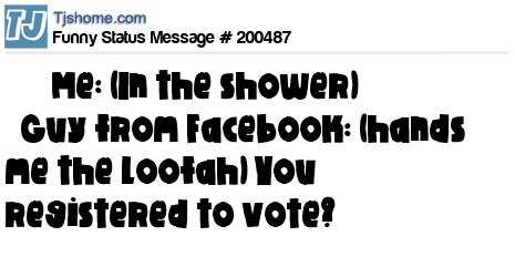 X says Me: (In the shower) Guy from Facebook: (hands me the loofah) You registered to vote?