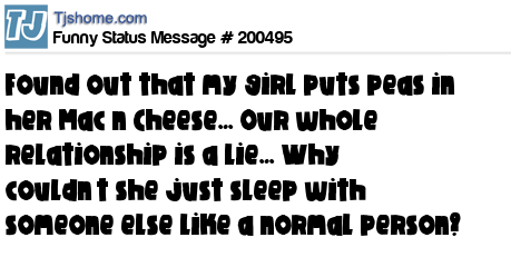 X says Found out that my girl puts peas in her Mac n Cheese… Our whole relationship is a lie… Why couldn’t she just sleep with someone else like a normal person?