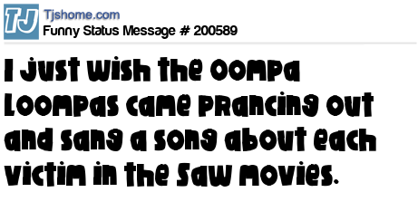 X says I just wish the Oompa Loompas came prancing out and sang a song about each victim in the Saw movies.