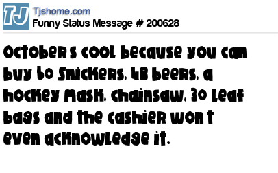 X says October’s cool because you can buy 60 Snickers, 48 beers, a hockey mask, chainsaw, 30 leaf bags and the cashier won’t even acknowledge it.