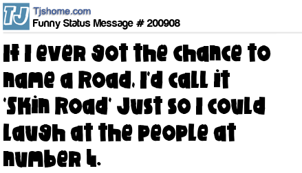 - # 78816 If I ever got the chance to name a Road, I'd call it 'Skin Road' Just so I could laugh at the people at number 4.