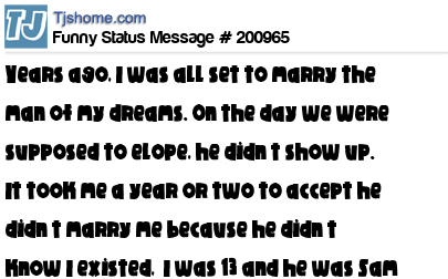 X says Years ago, I was all set to marry the man of my dreams. On the day we were supposed to elope, he didn’t show up. It took me a year or two to accept he didn’t marry me because he didn’t know I existed, I was 13 and he was Sam Elliot ;-)