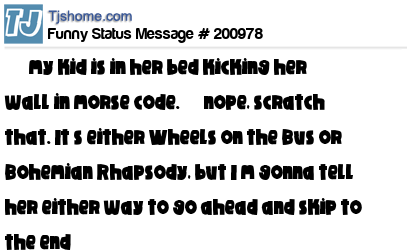X says my kid is in her bed kicking her wall in morse code. nope, scratch that. It’s either Wheels on the Bus or Bohemian Rhapsody, but I’m gonna tell her either way to go ahead and skip to the end