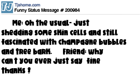 X says Me: oh the usual- just shedding some skin cells and still fascinated with champagne bubbles and tree bark. Friend: why can’t you ever just say “fine thanks”?