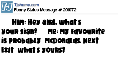 X says Him: Hey girl, what’s your sign? Me: My favourite is probably “McDonalds, Next Exit” what’s yours?