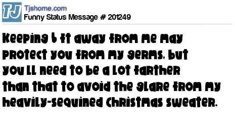 X says Keeping 6 ft away from me may protect you from my germs, but you’ll need to be a lot farther than that to avoid the glare from my heavily-sequined Christmas sweater.