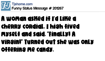X says A woman asked if I'd like a cherry cordial. I high fived myself and said, "Finally! A virgin!" Turned out she was only offering me candy.