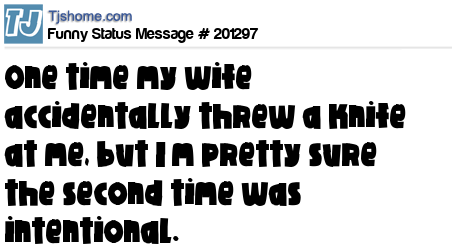 X says One time my wife accidentally threw a knife at me, but I’m pretty sure the second time was intentional.