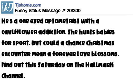 X says He’s a one eyed optometrist with a cauliflower addiction. She hunts babies for sport. But could a chance Christmas encounter mean a forever love blossoms. Find out this Saturday on The Hallmark Channel.