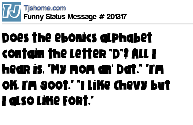 X says Does the ebonics alphabet contain the letter "D"? All I hear is, "My mom an' Dat." "I'm ok, I'm goot." "I like Chevy but I also like Fort."