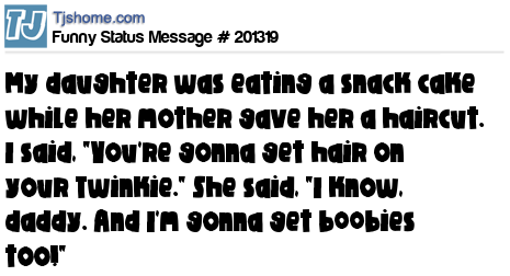 X says My daughter was eating a snack cake while her mother gave her a haircut. I said, "You're gonna get hair on your Twinkie." She said, "I know, daddy. And I'm gonna get b00bies too!"