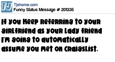 - # 195569 Calling your girlfriend your "lady friend" is a great way to let everyone know you both met on Craigslist.