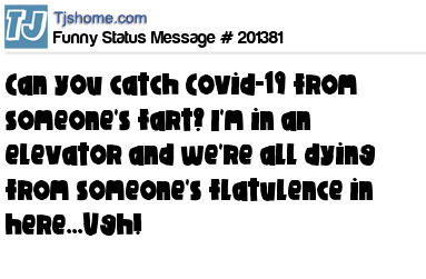 X is Can you catch Covid-19 from someone's fart? I'm in an elevator and we're all dying from someone's flatulence in here...Ugh!