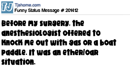 X says Before my surgery, the anesthesiologist offered to knock me out with gas or a boat paddle. It was an ether/oar situation.
