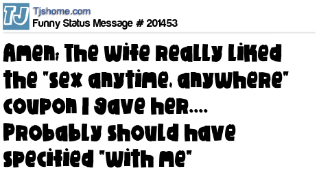 X says Amen; The wife really liked the "sex anytime, anywhere" coupon I gave her.... Probably should have specified "with me"