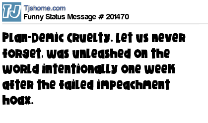 X says Plan-Demic Cruelty. Let us never forget, was unleashed on the world intentionally one week after the failed impeachment hoax.