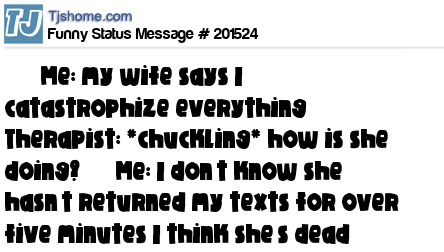 X says Me: my wife says I catastrophize everything Therapist: *chuckling* how is she doing? Me: I don’t know she hasn’t returned my texts for over five minutes I think she’s dead