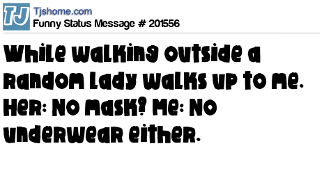 X While walking outside a random lady walks up to me. Her: No mask? Me: No underwear either.