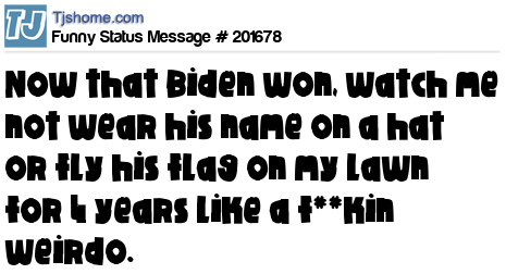X is Now that Biden won, watch me not wear his name on a hat or fly his flag on my lawn for 4 years like a f**kin weirdo.