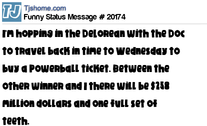 X is I'm hopping in the DeLorean with the Doc to travel back in time to Wednesday to buy a Powerball ticket. Between the other winner and I there will be $258 million dollars and one full set of teeth.
