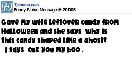 X says Gave my wife leftover candy from Halloween and she says “why is this candy shaped like a ghost? “ I says “cuz you my boo”.