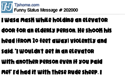 X says I wasa mask while holding an elevator door for an elderly person. He shook his head (from 20 feet away) violently and said, "I wouldn't get in an elevator with another person even if you paid me!" I'd had it with these rude sheep. I took off my m