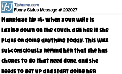 X is Marriage tip #6: When your wife is laying down on the couch, ask her if she plans on doing anything today. This will subconsciously remind her that she has chores to do that need done, and she needs to get up and start doing her chores.