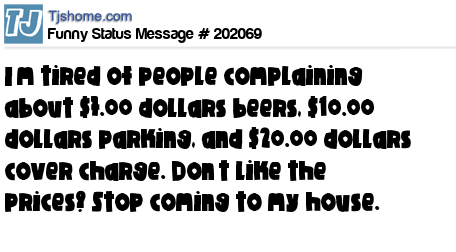 X says I’m tired of people complaining about $7.00 dollars beers, $10.00 dollars parking, and $20.00 dollars cover charge. Don’t like the prices? Stop coming to my house.