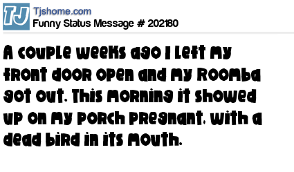 X says A couple weeks ago I left my front door open and my Roomba got out. This morning it showed up on my porch pregnant, with a dead bird in its mouth.