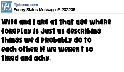 X says Wife and I are at that age where foreplay is just us describing things we’d probably do to each other if we weren’t so tired and achy.