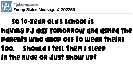 X says So 10-year old's school is having PJ day tomorrow and asked the parents who drop off to wear theirs too. Should I tell them I sleep in the nude or just show up?