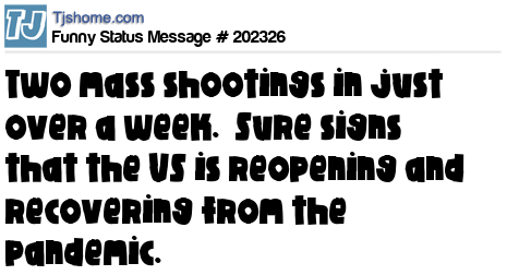 X Two mass shootings in just over a week. Sure signs that the US is reopening and recovering from the pandemic.