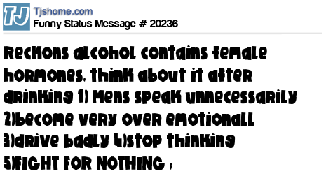 X reckons alcohol contains female hormones, think about it after drinking 1) Mens speak unnecessarily 2)become very over emotionall 3)drive badly 4)stop thinking 5)FIGHT FOR NOTHING ;