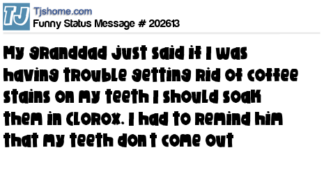 X says My granddad just said if I was having trouble getting rid of coffee stains on my teeth I should soak them in Clorox. I had to remind him that my teeth don’t come out