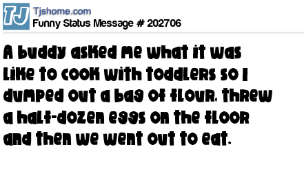 X says A buddy asked me what it was like to cook with toddlers so I dumped out a bag of flour, threw a half-dozen eggs on the floor and then we went out to eat.