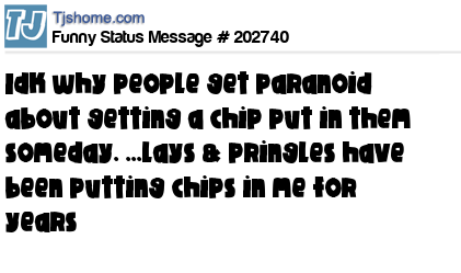 X says idk why people get paranoid about getting a chip put in them someday. ...lays & pringles have been putting chips in me for years