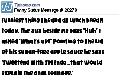 X Funniest thing I heard at lunch break today. The guy beside me says "Huh" I asked "What's up?" Pointing to the lid of his sugar-free apple sauce he says, "Sweetend with Splenda...that would explain the anal leakage."