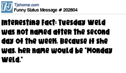 - # 205800 Many people think that Tuesday Weld is named after the second day of the week. But if that was true her name would be Monday Weld.