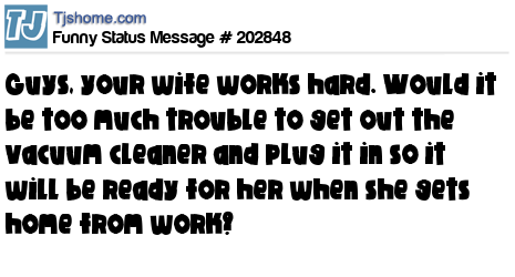 - # 207407 Guys, your wife works hard all day. Is it too much to ask for you to get the vacuum cleaner out of the closet and plug it in so that it will be ready when she gets home?