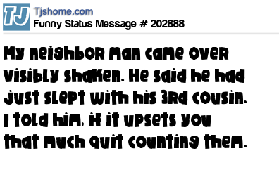 X says My neighbor man came over visibly shaken. He said he had just slept with his 3rd cousin. I told him, if it upsets you that much quit counting them.
