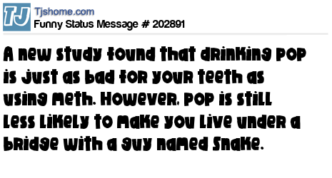 X says A new study found that drinking pop is just as bad for your teeth as using meth. However, pop is still less likely to make you live under a bridge with a guy named Snake.