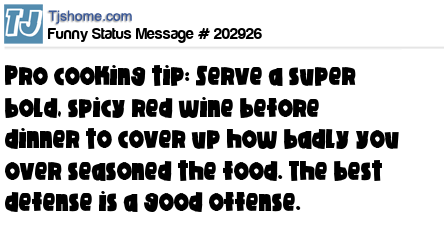 X says Pro cooking tip: Serve a super bold, spicy red wine before dinner to cover up how badly you over seasoned the food. The best defense is a good offense.