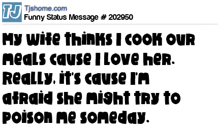 - # 192795 My wife thinks I cook our meals cause I love her. Really, it's cause I'm afraid she might try to poison me.