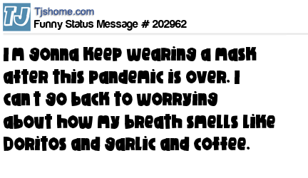 X says I’m gonna keep wearing a mask after this pandemic is over. I can’t go back to worrying about how my breath smells like Doritos and garlic and coffee.