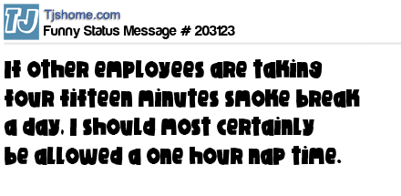 - # 178980 If other employees are taking four fifteen minutes smoke breaks a day, I should most certainly be allowed a one hour nap time.